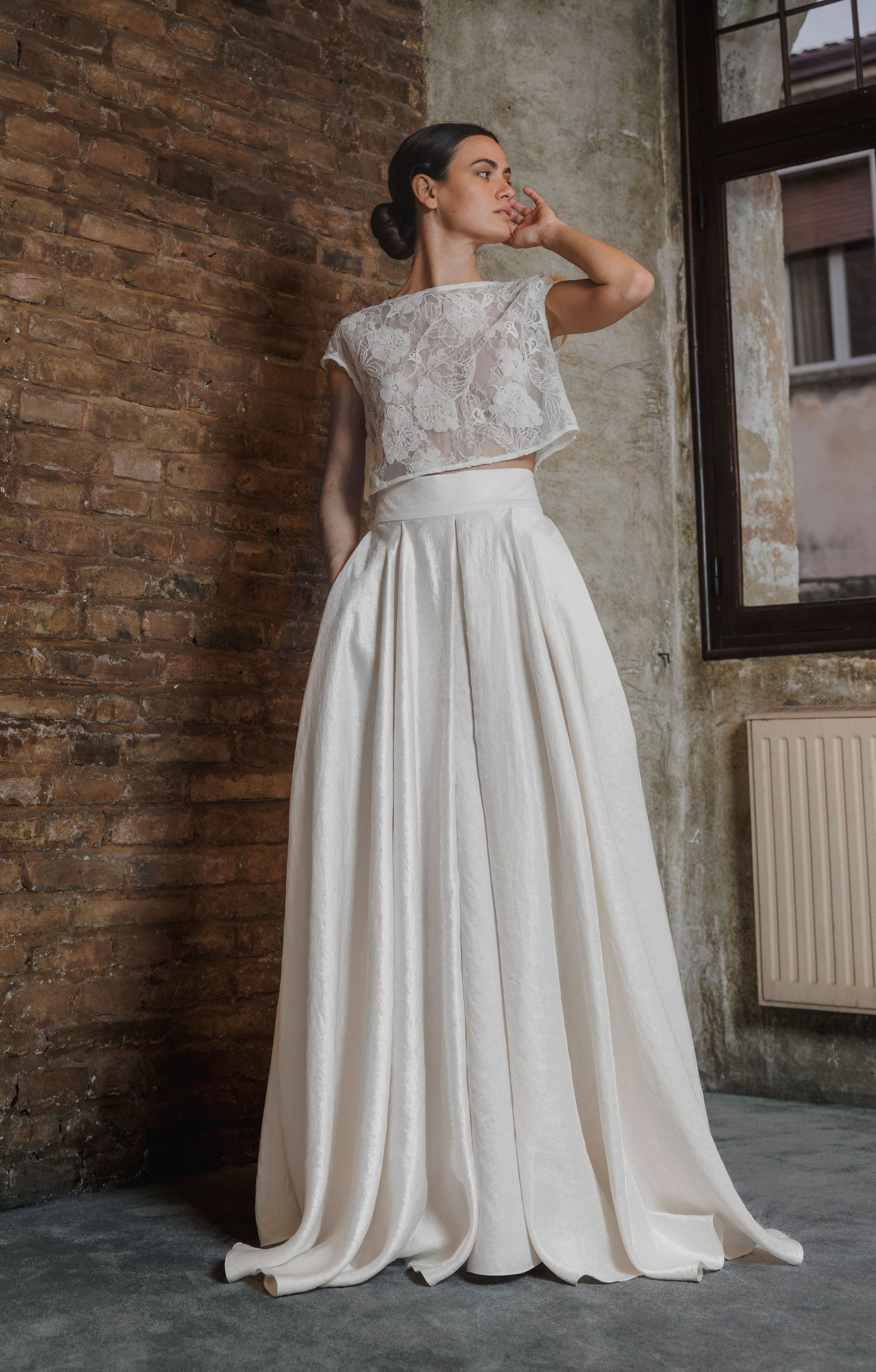 La collezione presenta una selezione esclusiva di abiti e accessori coordinati, tra cui guanti, borse e bracciali, tutti realizzati con la cura e attenzione al dettaglio da mani esperte. Ogni capo nasce dall’incontro tra tecnica sartoriale e ricerca materica, un dialogo continuo che valorizza l’unicità di chi lo indosserà. Drappeggi, pieghe, orlature e ricami arricchiscono ogni abito e accessorio, la selezione di materiali pregiati e l’accostamento di texture conferiscono profondità, movimento e unicità a ogni creazione.
